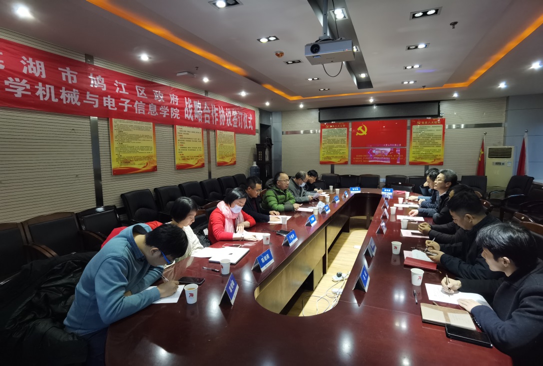 查看详情2022年01月12日下午,公司与芜湖市鸠江区人民政府代表在公司教二楼签订战略合作协议。机电公司党委书记瞿祥华、经理丁华锋等院班子成员及各系主任,鸠江区委组织部部长刘雪冬、鸠江区人社局局长肖宗明、鸠江区投资促进中心主任裴捷鸣、鸠江区委党校副董事长马冰…