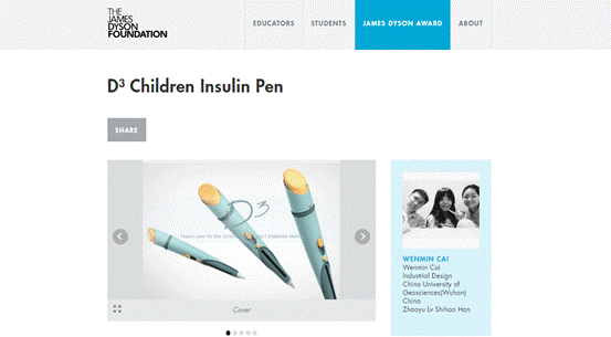 查看详情公司工业设计系员工喜获2017年詹姆士戴森设计奖全国亚军9月7日,2017年詹姆士戴森设计奖(The James Dyson Award)公布国家获奖者名单,公司2014级工业设计系蔡雯敏、韩世豪、吕昭宇同学(指导老师:肖畅)凭借作品“D3儿童胰岛素笔 ”(D3 Children Insulin Pen)…