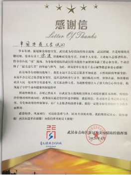风雨同心,共抗疫情:机电公司收到青山区新冠肺炎疫情防控指挥部感谢信