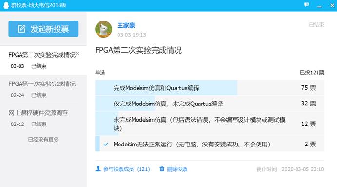 在大部分同学都具备硬件条件并成功安装和破解了Modelsim和Quartus的前提下,王家豪老师根据“数字电路建模、测试模块编写、功能仿真、Quartus编译综合,在FPGA开发板下载码流文件并测试数字电路的功能”这一实验基本流程(除最后一步无法在现有条件下完成),采取分班分时段教学答疑、直播与录播相结合、电脑远程控制解决问题、集中统计实验完成情况等方式进行了实验课程的教学,以达到让员工熟悉和掌握Modelsim和Quartus软件使用方法的实验教学目的。