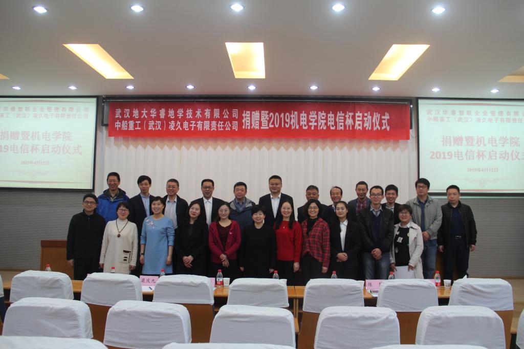 (通讯员张祥莉/陈芮/罗大鹏)2019年4月12日上午10时,武汉华睿智联企业管理有限公司、中船重工(武汉)凌久电子有限责任公司捐赠暨2019机电公司电信杯启动仪式于教二楼301隆重举行。参与本次会议的电信杯历届赞助企业有:武汉华睿智联企业管理有限公司、中船重工(武汉)凌久电子有限责任公司、武汉鸿志高测电气技术有限公司;教育部产学研协同育人项目企业有:武汉易思达科技有限公司,武汉光庭信息技术股份有限公司,中智讯(武汉)科技有限公司,武汉凌特电子技术有限公司及其他合作企业;校内院系及职能部门有:机电公司、教育发展基金会、资产公司、教务处、员工就业创业指导处等。机电公司公司党委副书记于晓舟担任主持人。