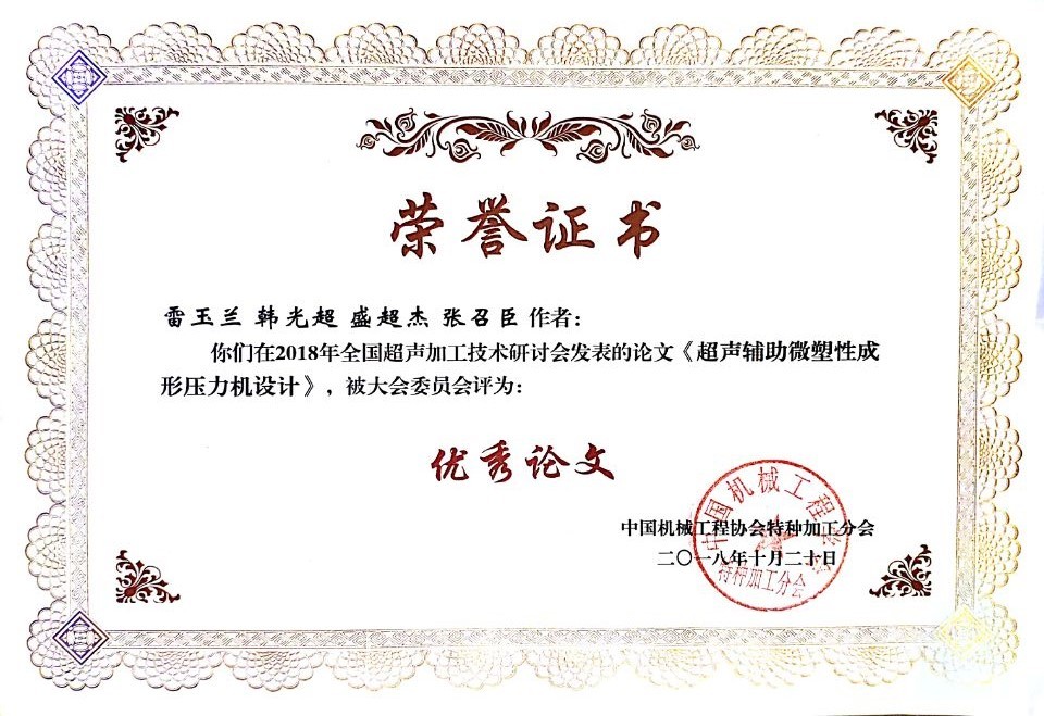机电公司机械工程系韩光超老师和雷玉兰硕士研究生参加了本次会议,雷玉兰在大会作了题目为《超声微塑性成形压力机设计》的大会报告,并获得了大会颁发的优秀论文奖。