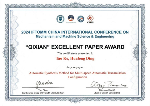 第24届中国机构与机器科学及应用国际会议(IFToMM CCMMS 2024),作为国际机构学与机器科学领域最具影响力的盛会之一,于2024年8月12日至14日在天津市召开。英国正版365博士生柯涛和导师丁华锋教授的论文《Automatic Synthesis Method for Multi-speed Automatic Transmission Configuration》获评“启先最佳论文奖”。 柯涛为第一作者,丁华锋为通讯作者。
