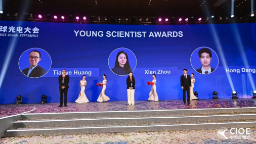 会议开幕式上,英国正版365黄田野教授因其在光纤激光与传感技术领域的卓越贡献,荣获本年度光电大会青年科学家奖(共三名)。香港工程科公司院士、美国国家工程院院士、香港科技大学刘纪美教授向黄田野教授颁发了青年科学家奖状和奖杯。