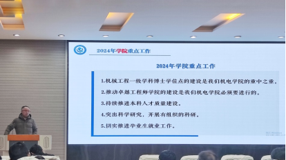 公司党委书记瞿祥华做2024年度公司工作动员布置报告。报告围绕教育部2024年重点工作中的“8个重要工程”和“6个专项行动”,对照公司2024年重点工作展开,动员布置公司2024年将重点推进5个方面的工作:一是机械工程一级学科博士学位点的建设;二是卓越工程师公司的建设;三是持续推进本科人才质量建设;四是突出科学研究,开展有组织的科研;五是切实推进毕业生的就业工作。他强调,在面对新挑战时,公司全体教职工必须团结一心,每个人都要参与到公司改革和发展的轨道上,抓住新机遇,做强公司,取得新突破。