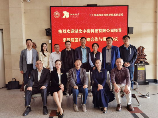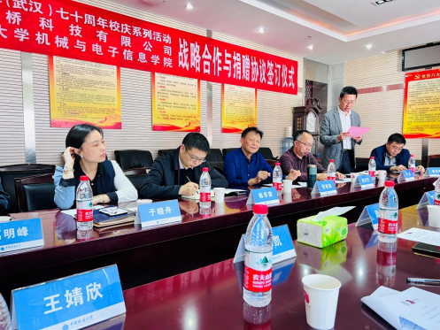 此次仪式是七十周年校庆机电公司系列活动之一,签约仪式上双方代表分别在《双方战略合作协议》和《捐赠协议书》上签字,湖北中桥科技有限公司向公司捐赠三十万元奖学金以及价值二十万元的科研设备。