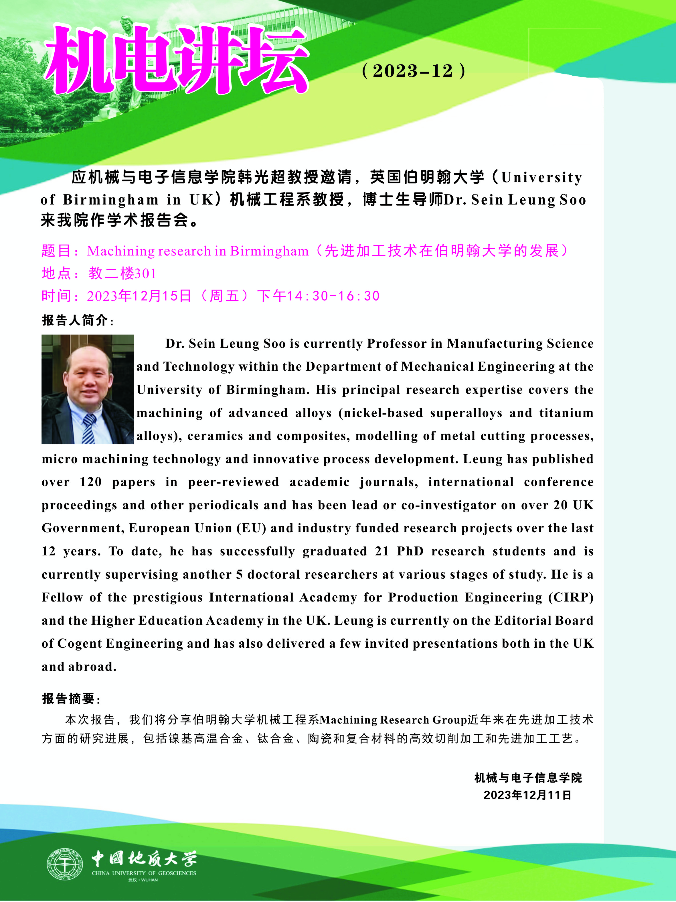 【12月15日】机电讲坛(2023-12):英国伯明翰大学Dr. Sein Leung Soo来公司作学术报告会