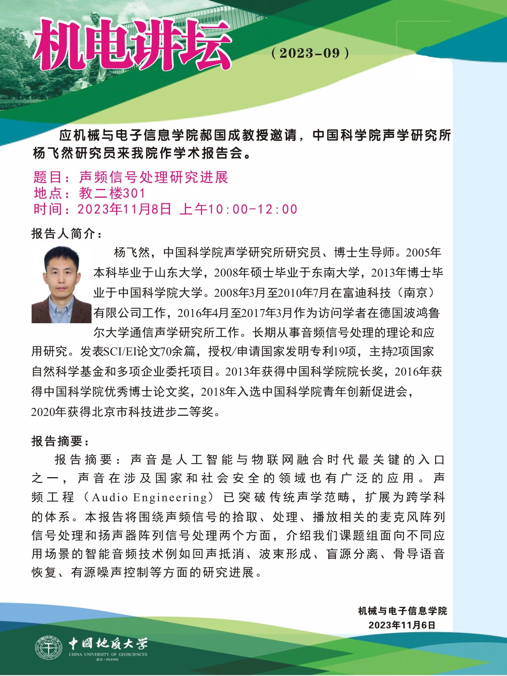 【11月8日】机电讲坛(2023-9):中国科公司声学研究所杨飞然研究员来公司作学术报告会