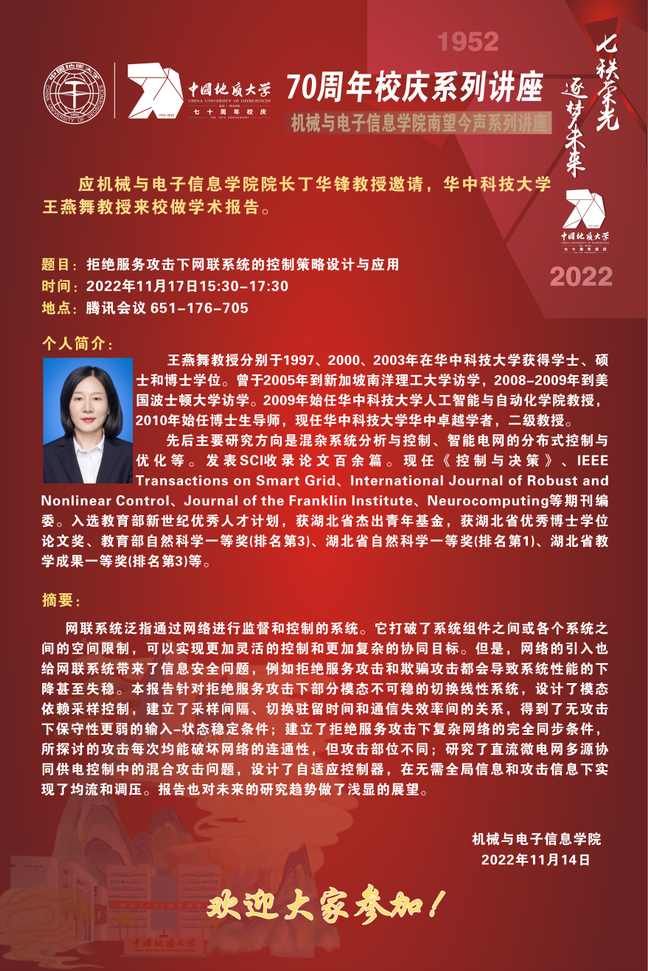 【11月17日】校庆系列学术活动---机电讲坛(2022-30):华中科技大学王燕舞教授