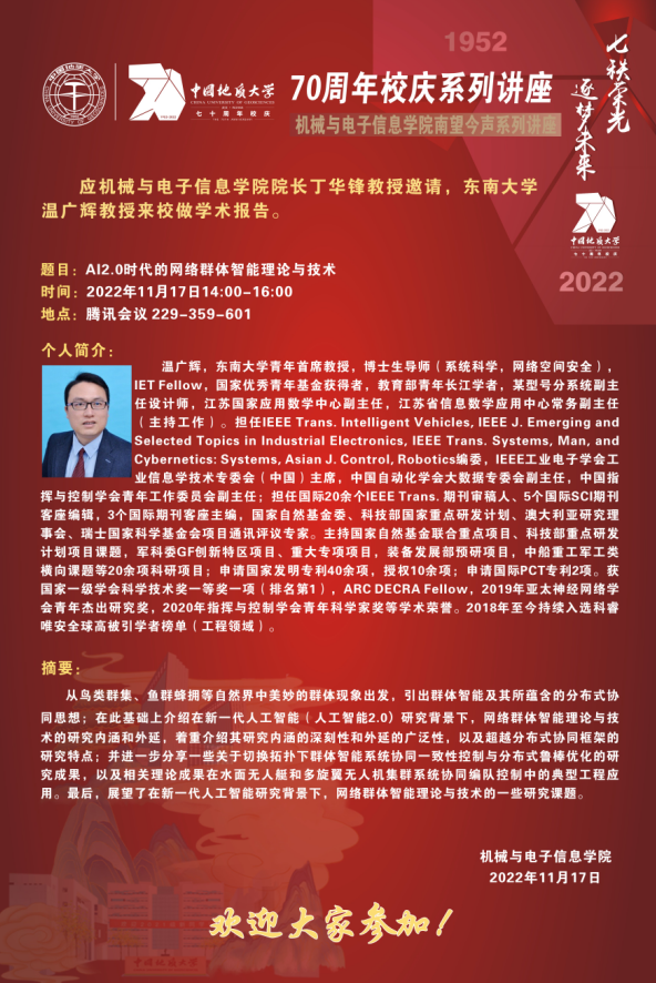 【11月17日】校庆系列学术活动---机电讲坛(2022-29):东南大学温广辉教授