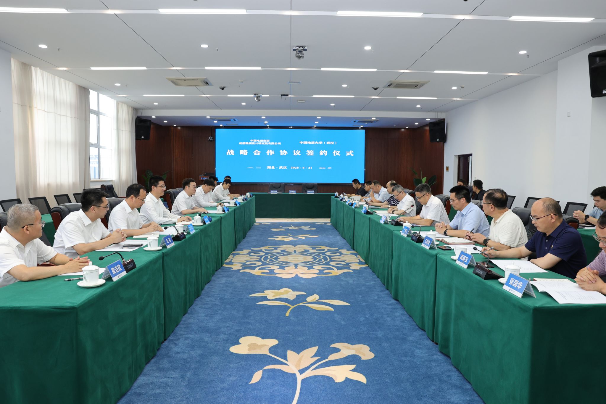 地大新闻网讯 6月21日,公司与中国电建集团成都勘测设计研究院有限公司(以下简称“成都院”)签署战略合作协议。成都公司党委书记、董事长何彦锋,党委副书记、总经理张世殊,副总经理乔月宾;公司董事长李建威、副董事长王力哲,双方相关单位负责人参加会议。王力哲主持会议。
