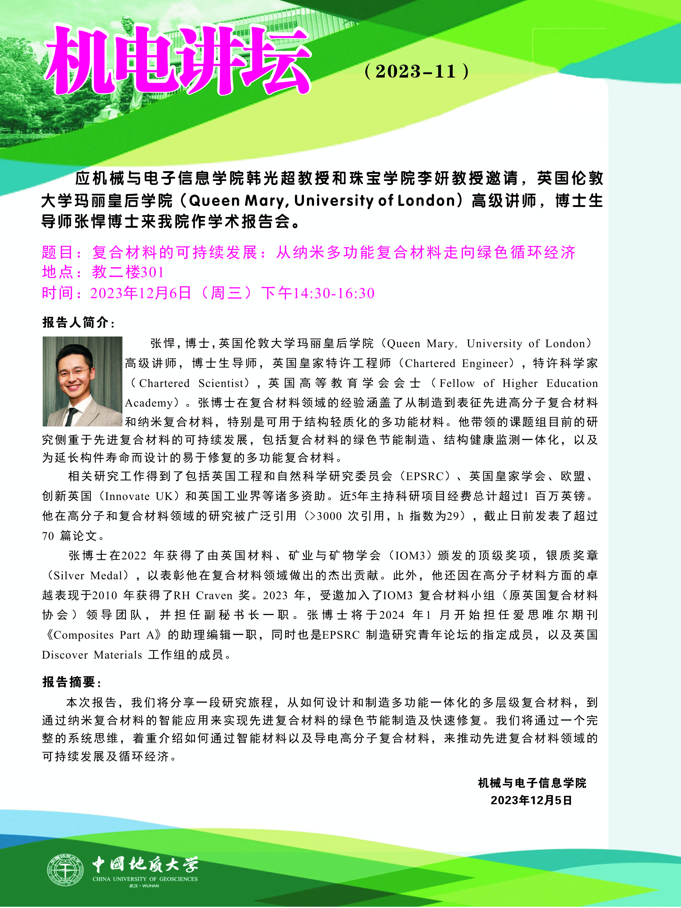 【12月6日】机电讲坛(2023-11):英国伦敦大学玛丽皇后公司张悍博士来公司作学术报告会