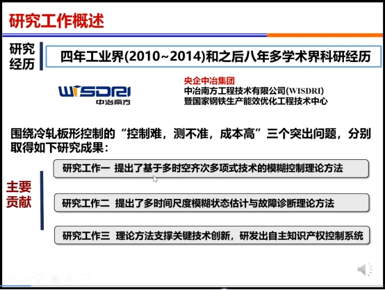 在报告中,解教授首先围绕冷轧板形控制的“控制难、测不准、成本高”三个突出问题,分别提出了基于多时空齐次多项式技术的模糊控制理论方法,提出了多时间尺度模糊状态估计与故障诊断理论方法,并通过理论方法支撑关键技术创新,研发出自主知识产权控制系统。研究成果以第一/通信作者发表IEEE汇刊、中科院一区、自动化学报等权威论文61篇(其中IEEE汇刊36篇,ESI前1%高被引论文17篇,SCI他引4296次,单篇最高他引223次),研究成果受到17位中外院士、47位海外IEEE Fellow、39位大陆IEEE Fellow/杰青/长江学者高度肯定评价。