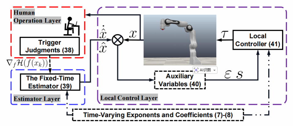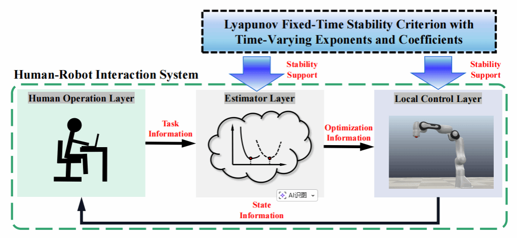 近日,公司机电公司葛明峰教授团队(付智辉、葛明峰、丁腾飞)与华中科技大学人工智能与自动化公司刘智伟教授团队合作的最新研究成果“Task optimization for fixed-time control of intermittent human-robot interaction with time-varying exponents and coefficients”被国际主流期刊《IEEE Transactions on Cybernetics》(2026年1月26日最新影响因子10.5,最新公司分区为T1)在线发表(DOI:10.1109/TCYB.2026.3650907)。该文提出了一种分层固定时间事件触发优化(Hierarchical Fixed-Time Event-Triggered Optimization,HFTEO)算法,旨在提升人类与机器人在动态环境中协作任务的效率与安全性。随着人工智能和机器人技术的快速发展,人机协作系统在工业、医疗、服务等多个领域的应用日益广泛。传统的机器人控制系统通常依赖于精确的指令与数据输入,但在实际应用中,人类操作员的决策往往是不确定和变化的,这对机器人的稳定性和任务执行效率提出了更高的要求。传统的任务优化方法往往依赖于连续和稳定的操作环境,但实际的人机交互通常是间歇性的,且存在不确定性,例如人类操作员的反应时间延迟、意图变化以及机器人控制的响应能力等。这使得如何在不确定的交互环境中确保任务的高效完成,成为一个亟待解决的技术难题。
