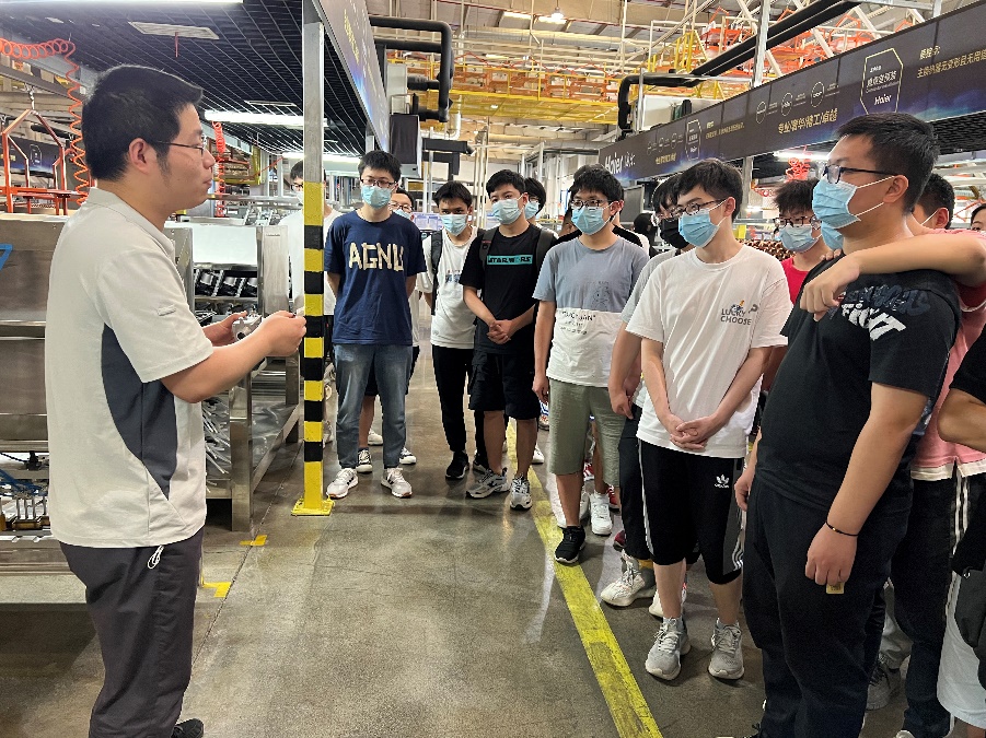 海尔集团工艺技术总监刘鹏带领全体同学走进生产线,参观产品生产流程,悉心讲述海尔集团在工艺技术上的创新突破,以及当下国内外技术差距与缺口。讲解过程中,刘鹏与同学们热情互动,引导同学们将课程所学与实际生产相结合,积极思考如何简化生产步骤,在保质保量的情况下达到最优的生产效率。