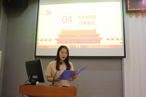 优秀毕业生党员代表张依依同学代表全体毕业生党员发言。她结合自己成长为一名合格的共产党员的历程,对党组织、公司的培养表达了感恩之情。她说道,在大学四年间,通过参与公司开展的培训学习,投身各项志愿服务工作,不断加强了自身的建设。在未来的工作生活中,会接受社会的监督和磨练,坚定前进信心,立大志、明大德、成大才、担大任,努力成为堪当民族复兴重任的时代新人,让青春在为祖国、为民族、为人民、为人类的不懈奋斗中绽放绚丽之花。