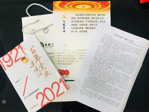 瞿祥华代表公司党委向2021届毕业生党员代表赠送毕业生党员纪念礼包。礼包以“学党史、强信念、跟党走”为主题,由包括党史主题学习教材、毕业生党员专属贺卡、致2021届毕业生党员的一封信在内的5件礼物组成。