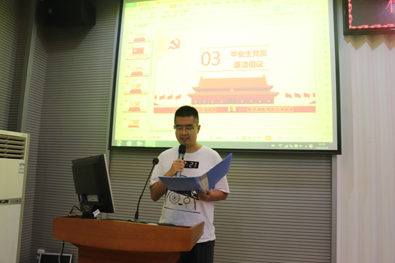 毕业生党员赵昺琛同学代表全体毕业生党员宣读廉洁倡议书,号召大家牢记党员身份,加强道德修养,筑牢思想防线。在今后的工作生活中,要坚守初心,弘扬正气,起到党员模范作用。聚是一团火,散是满天星,无论今后身处何地,都要永葆初心之志、继续砥砺前行。