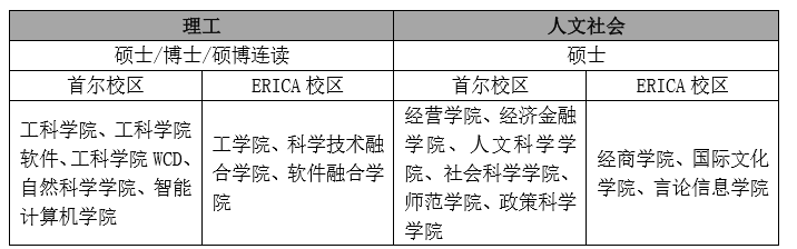 该校分为有首尔和ERICA两大校区。公司硕士学位课程,6个系列 1个学部 89门学科,26个学科间协同课程,35个学研产协同课程。博士学位课程,6个系列 1个学部 85门学科,19个学科间协同课程,37个学研产协同课程。