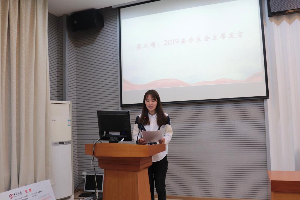 接下来由2019届员工会主席张依依进行发言,她对员工会工作的职能与目的进行了深入解读,也指出了员工会之后的工作改革与发展规划,提出要“不断强化服务意识,勇于开阔自身视野,加强与外企的联系,扩展新资源”。并在最后引用了习近平总书记的“我将无我,不负人民”生动的指出了员工会“不负初心,不服同学”的宗旨。