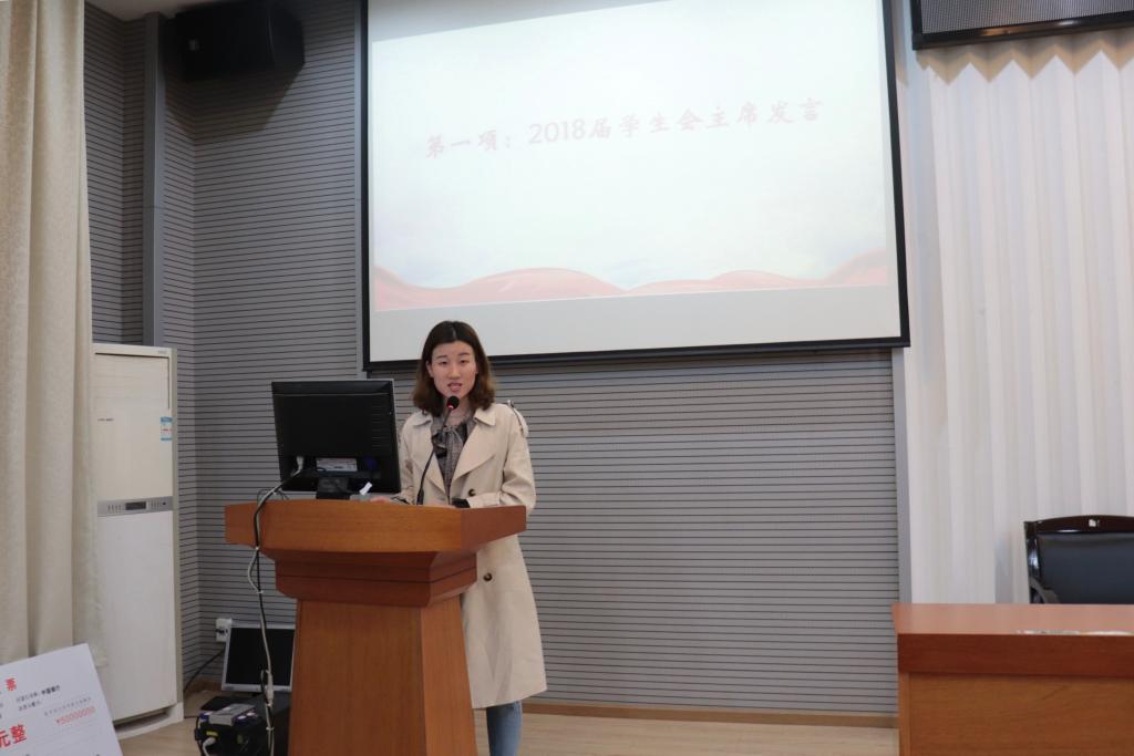 会议进行第一项,由2018届员工会主席乔婧发言。她提及了员工会2018年以来的活动与工作,细数了员工会工作所取得的成就与荣誉,也谈及了之后员工会的发展机遇与挑战,指出了几点员工会服务同学不忘初心的宗旨。最后主席乔婧表达了对员工会殷切的希望与祝福。