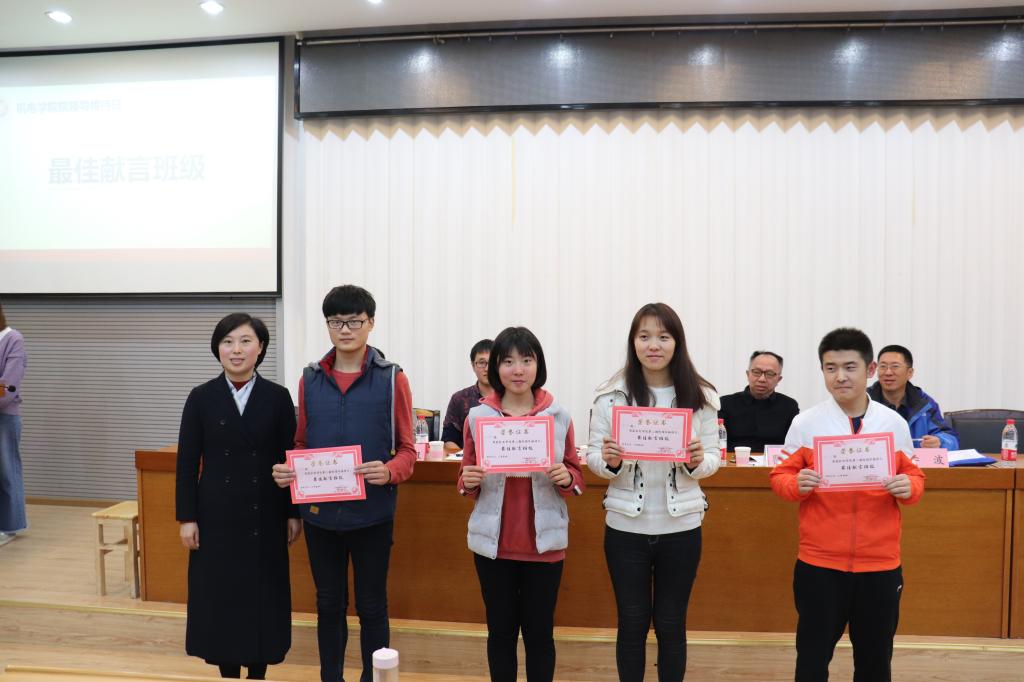 三大环节结束后,经过员工会的初期评选以及老师们的现场商讨,决定给予071183、072182、071172、075171“最佳献言班级奖”、给予杨庆澳同学“最佳建言献策奖”,于晓舟老师与李波老师分别为其颁奖并拍照留念。